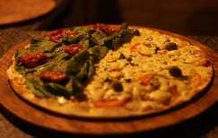 Mussarela, presunto, bacon, tomate seco e cebola.